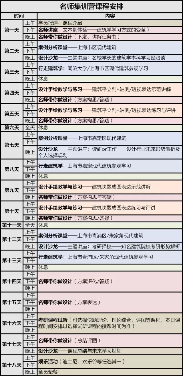 集训营课程总时长为18天,其中包含休息2天,集体活动安排共16天。