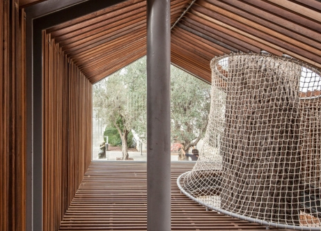 在以色列耶路撒冷博物馆的门口新修建的树屋,成了儿童聚集娱乐的场所。建筑师IfatFinkelman和DeborahWarschawski围绕一个松树搭建了一个小房子。房子是由2厘米厚的木板拼出来的,用了钢铁做结构,悬在了半空中,有一面安上了整面玻璃,侧面看像一个小房子。树屋中间掏了一个洞,使松树“穿房而过”,也让它们形成融合共生的关系。为了保护树干,还挂上了白色的网。树屋中间有几根做结构支撑的铁柱,其中一根的周围也掏了圆形的孔,它才是真正用来爬树的。上面有一些小的脚踏板,顺着爬上二楼,要比走外面的坡道快很多。正常进入树屋的方式是经过一段很长的坡道,有三次转折,它构成了一个小的围合区域。前半段仅比地面略高,是儿童游戏的地方,后面才是真正上坡的坡道,它下面的空间与树屋的下面同样可以玩耍。木板之间留有缝隙,到了晚上,树屋里的灯光就会透过玻璃和木板的缝隙照射到外面,像漂浮在半空中,是一个小的雕塑景观,也是室外广场唯一一个亮的地方。木板之间留有缝隙,到了晚上,树屋里的灯光就会透过玻璃和木板的缝隙照射到外面,像漂浮在半空中,是一个小的雕塑景观,也是室外广场唯一一个亮的地方。